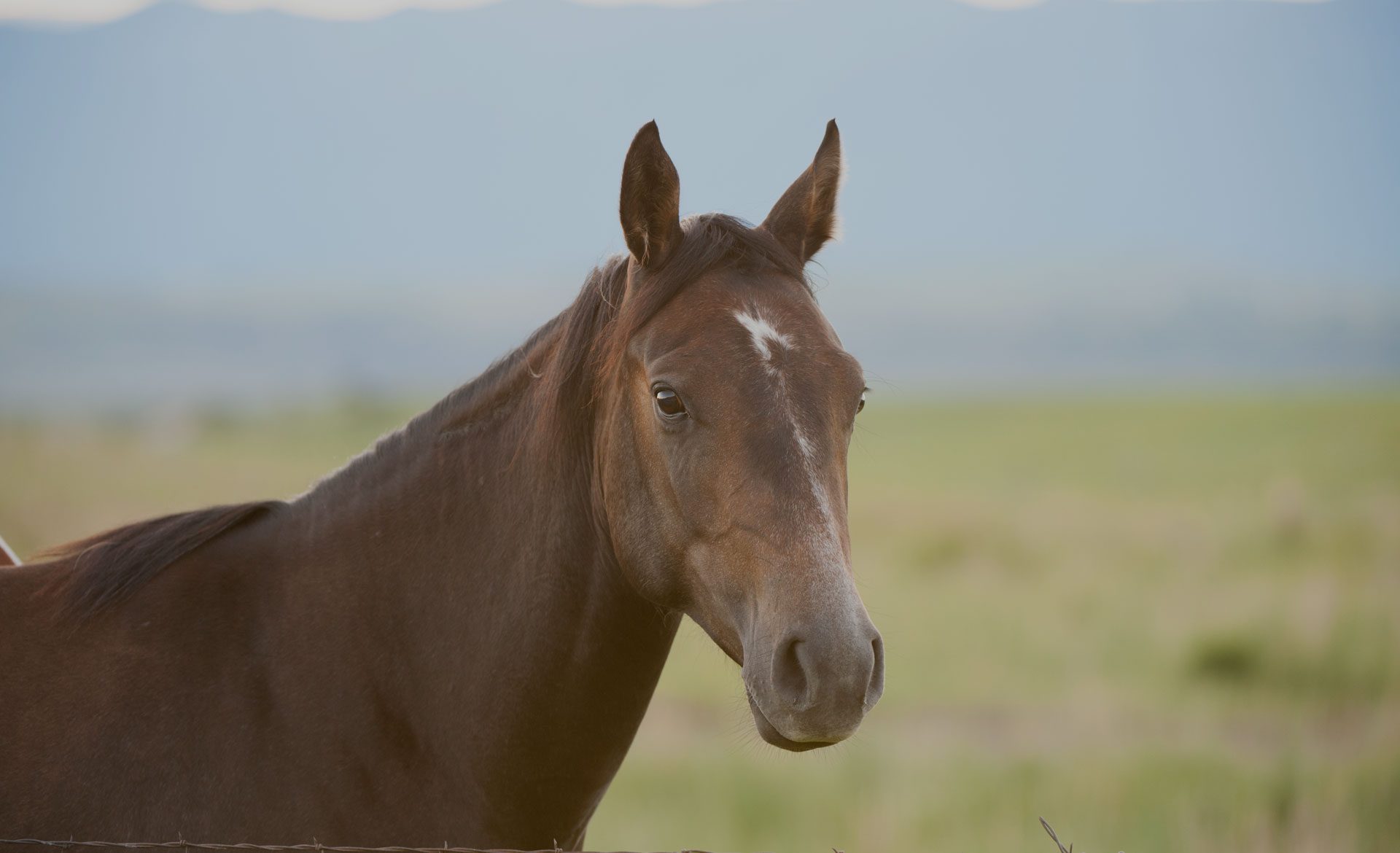 Brown horse in a grassy field